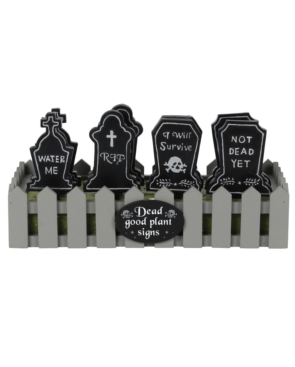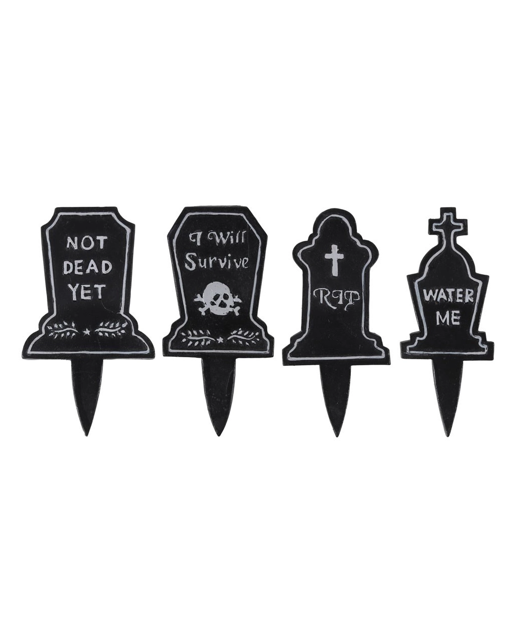 Wenn deine Zimmerpflanzen den Kopf hängen lassen und traurig vor sich hinwelken, brauchst du unbedingt dieses Pflanzenfriedhof Grabstein Schild. Es zeigt auf ironische Art, dass man dir besser keine Pflanzen anvertraut. Das witzige Pflanzenschild im Grabstein Design zeigt eine von vier möglichen Aufschriften: „Water Me“, „RIP“, „I will Survive“ oder „Not Dead Yet“. Stecke die Grabsteine in den Blumenkübel zu deiner Lieblingspflanze, und erinnere dich stets daran, sie gut zu behandeln und regelmäßig zu gießen. Die Grabsteine für Zimmerpflanzen sind ein cooles Gothic Wohnaccessoire und eine super Deko-Idee für die Halloween Zeit.