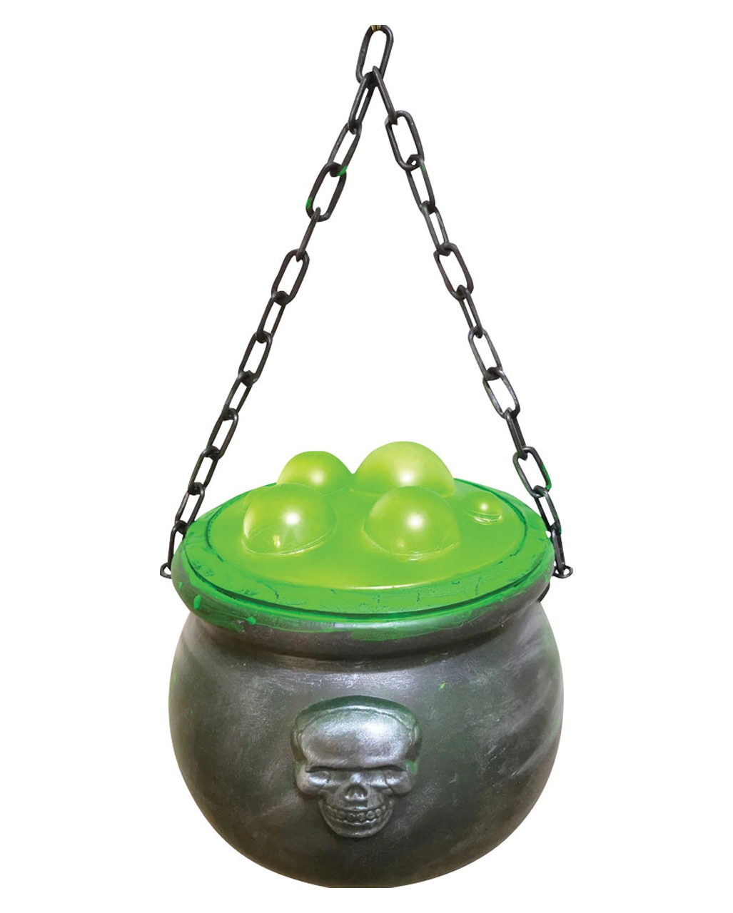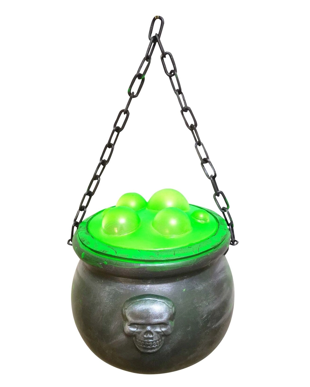 Unser kochender Hexenkessel als Deko besteht aus Kunststoff und verfügt über eine metallische Optik. Eine Totenschädel Prägung sorgt für einen zusätzlichen Eyecatcher. In der Hexentopf Animatronic befinden sich grüne Blasen an der Oberfläche, die grün leuchten – Ein mystischer Effekt für deine authentische Hexenkessel Deko! An der schmalen Kette lässt sich der brodelnde Topf an verschiedenen Orten aufhängen. Der Kessel ist als Halloween Deko für den Innen- & Außenbereich geeignet. Er ist ca. 20 cm hoch und wird durch laute Geräusche aktiviert. Bestelle noch mehr Gruseldeko wie den 2 Hexenkessel Backflow Räucherkegel Halter mit LED!